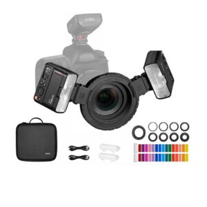 Diseñado para la fotografía de primeros planos, el kit de flash macro MF12 de 2 luces de Godox facilita la fotografía macro. Los cabezales de flash permiten capturar fotos hermosas y nítidas de pequeños sujetos como plantas, animales e insectos a una distancia extremadamente corta. Los cabezales de flash MF12 se pueden montar en los soportes de flash incluidos y cuentan con cabezales ajustables para un posicionamiento rápido. Para mayor versatilidad, los flashes se pueden montar directamente en un objetivo mediante los anillos adaptadores y el anillo de montaje incluidos, que permiten montar hasta seis cabezales de flash MF12. También se incluye un adaptador de posicionamiento para primeros planos extremos con una estructura inclinada especialmente diseñada que permite inclinar los cabezales de flash hacia el objetivo para obtener primeros planos extremos. Para su uso con o sin cámara, los cabezales de flash requieren un transmisor que se compra por separado y son compatibles con los disparadores de flash inalámbricos Godox XPro, X1, X2 y otros modelos seleccionados para cámaras de las principales marcas como Nikon, Sony, Canon, FUJIFIM, Olympus y Panasonic.